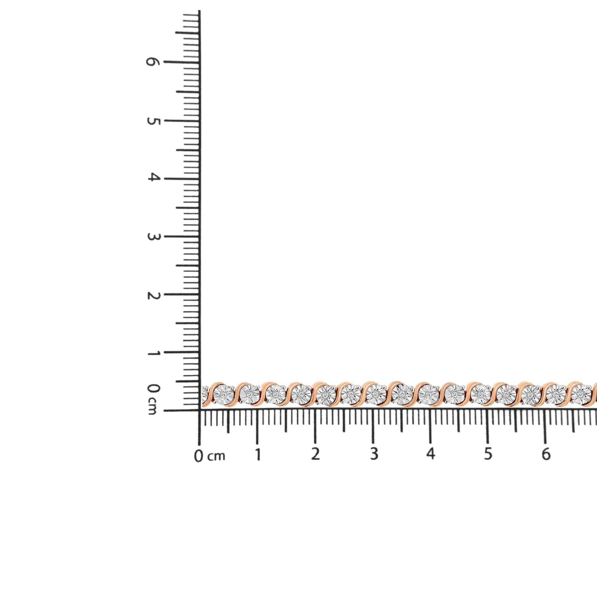 Elegant and timeless, this gorgeous 92.5% sterling silver tennis bracelet features 0.25 carat total weight of natural round brilliant cut white diamonds with 37 individual stones in all. The tennis bracelet has each diamond set into a faceted bezel style miracle plate setting sandwiched between faux bypass style waves of silver. The unique miracle-plate settings center each genuine diamond in a mirror-finish, high-polish frame, giving the illusion of a much larger stone. The 7” long bracelet culminates in a secure box with tongue and safety clasp. The bracelet comes in your choice of rhodium or 14 karat yellow or rose gold plated sterling silver. Whether worn for daytime glamour or evening sparkle, this classic tennis bracelet is gorgeously versatile. It’s a timeless treasure she’ll enjoy wearing every day.