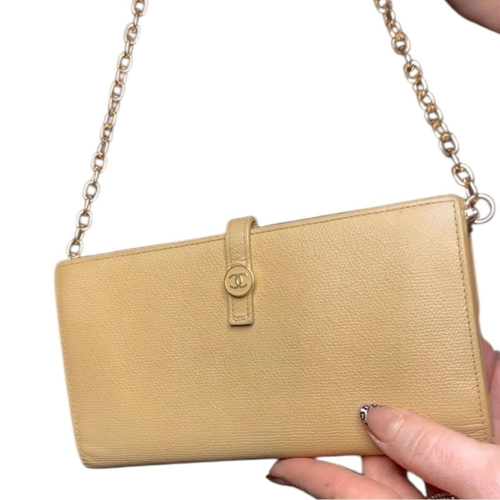 Authentic Chanel Beige leather wallet with unbranded chain strap added with grommets so it can be worn as a crossbody. Chain can be easily removed and used as just a wallet.