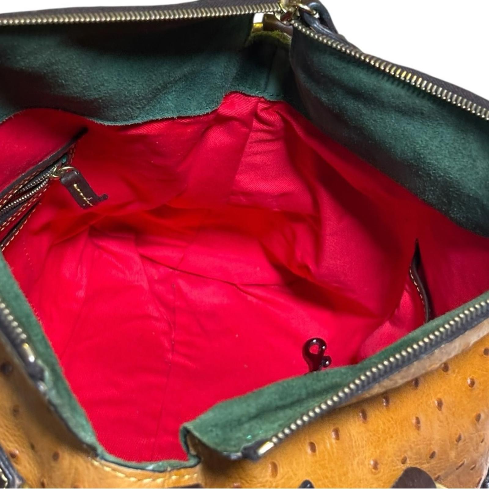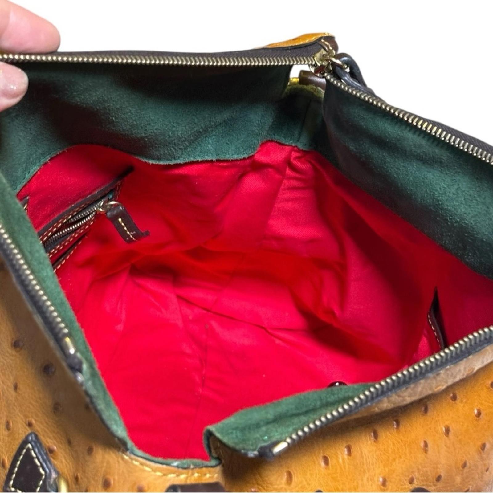 Authentic Dooney & Bourke Florentine satchel crafted in rich ostrich-embossed Florentine leather. Features dual rolled leather handles, removable adjustable crossbody strap, tassel zipper pulls, brass hardware, and a structured silhouette. Interior is fully lined in red fabric with zip and slip pockets. Includes original Dooney & Bourke dust bag. Classic luxury handbag with timeless appeal.