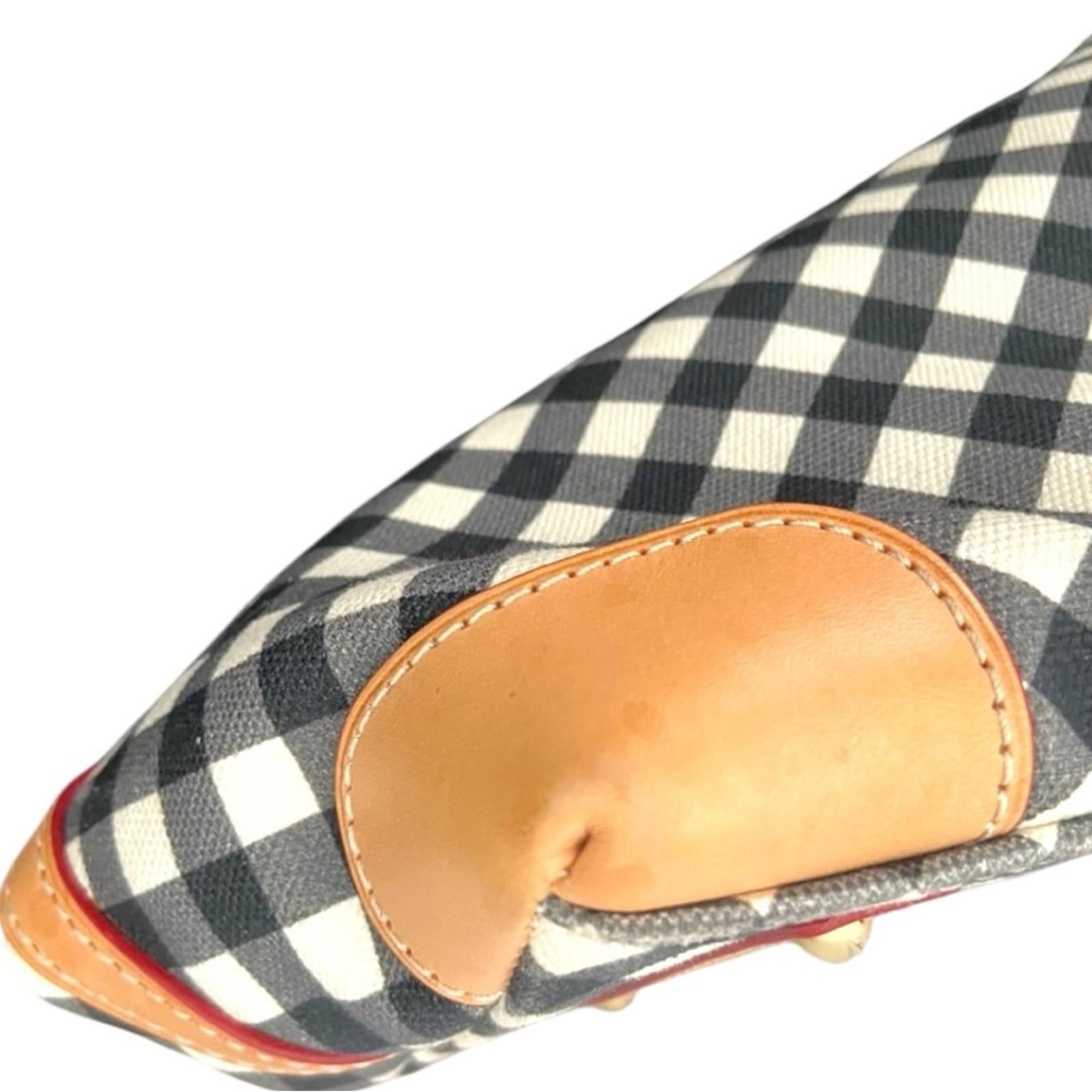 Elegant checkered design. Black and tan pattern. Durable leather handles. Perfect for daily use.
