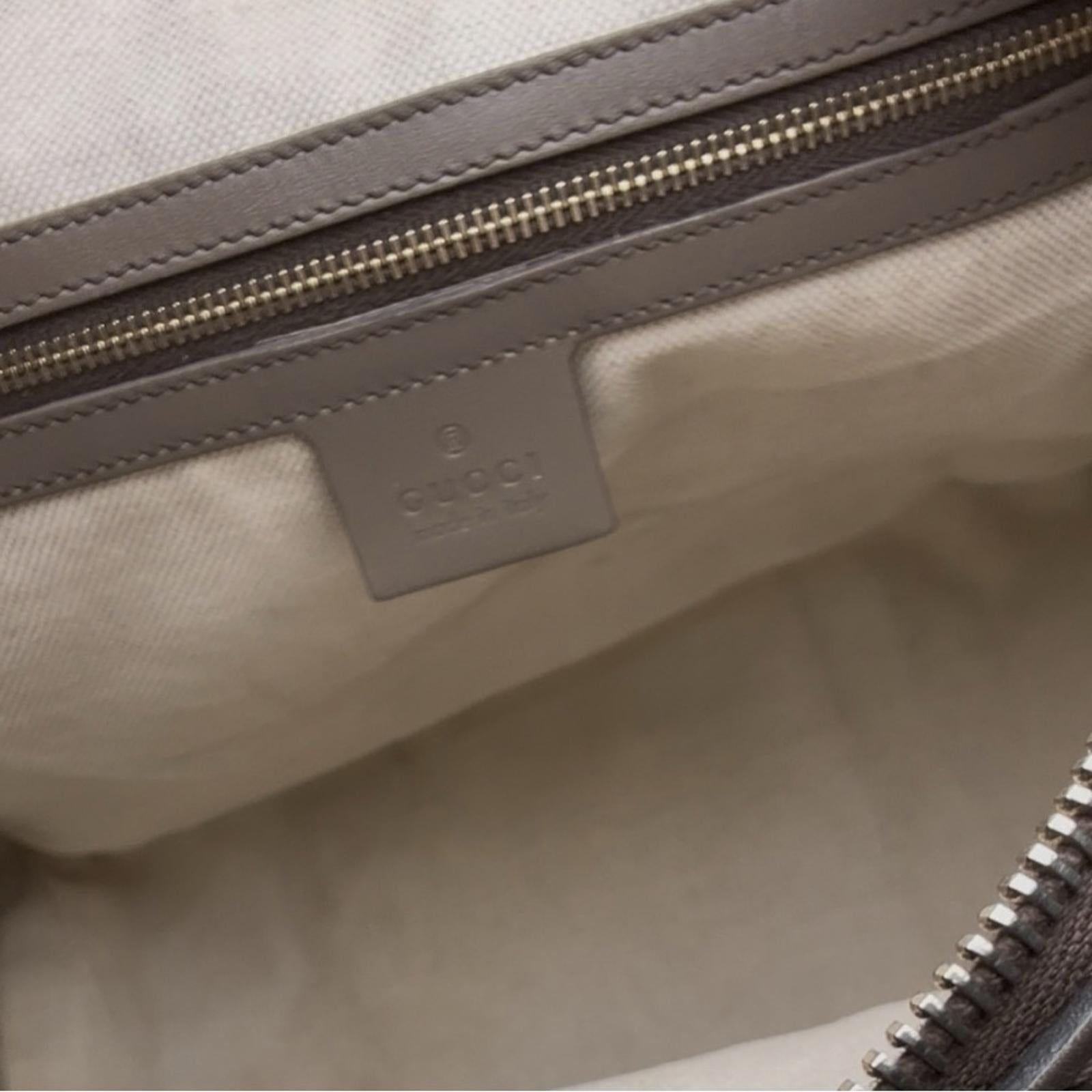Details: GG canvas; leather trim; web stripe; zip top; interior pockets.
