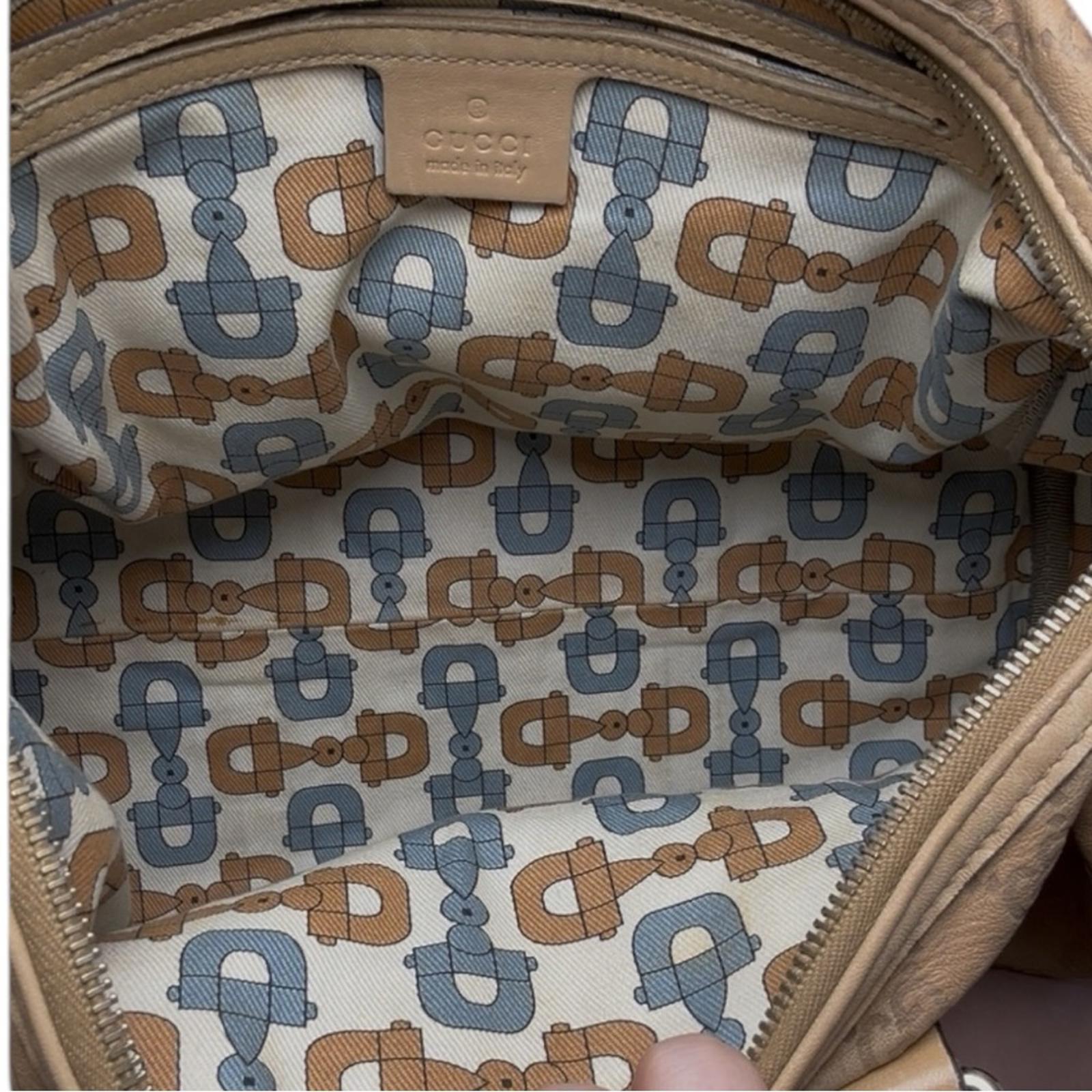 Gucci Guccissima embossed leather Boston bag crafted in beige leather with gold-tone hardware. Features a structured duffle-style silhouette, dual rolled leather handles, and a full top zip closure. Interior includes a spacious compartment with a zip pocket and slip pockets for organization. A timeless and durable Gucci travel-inspired design.