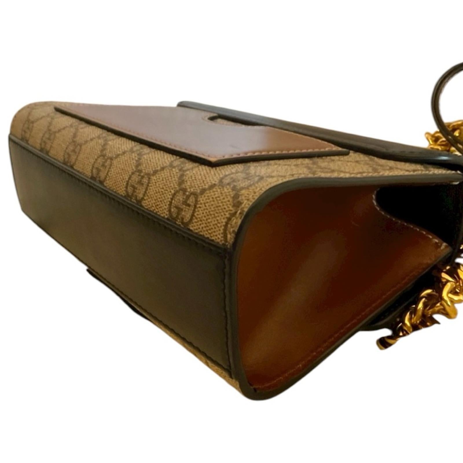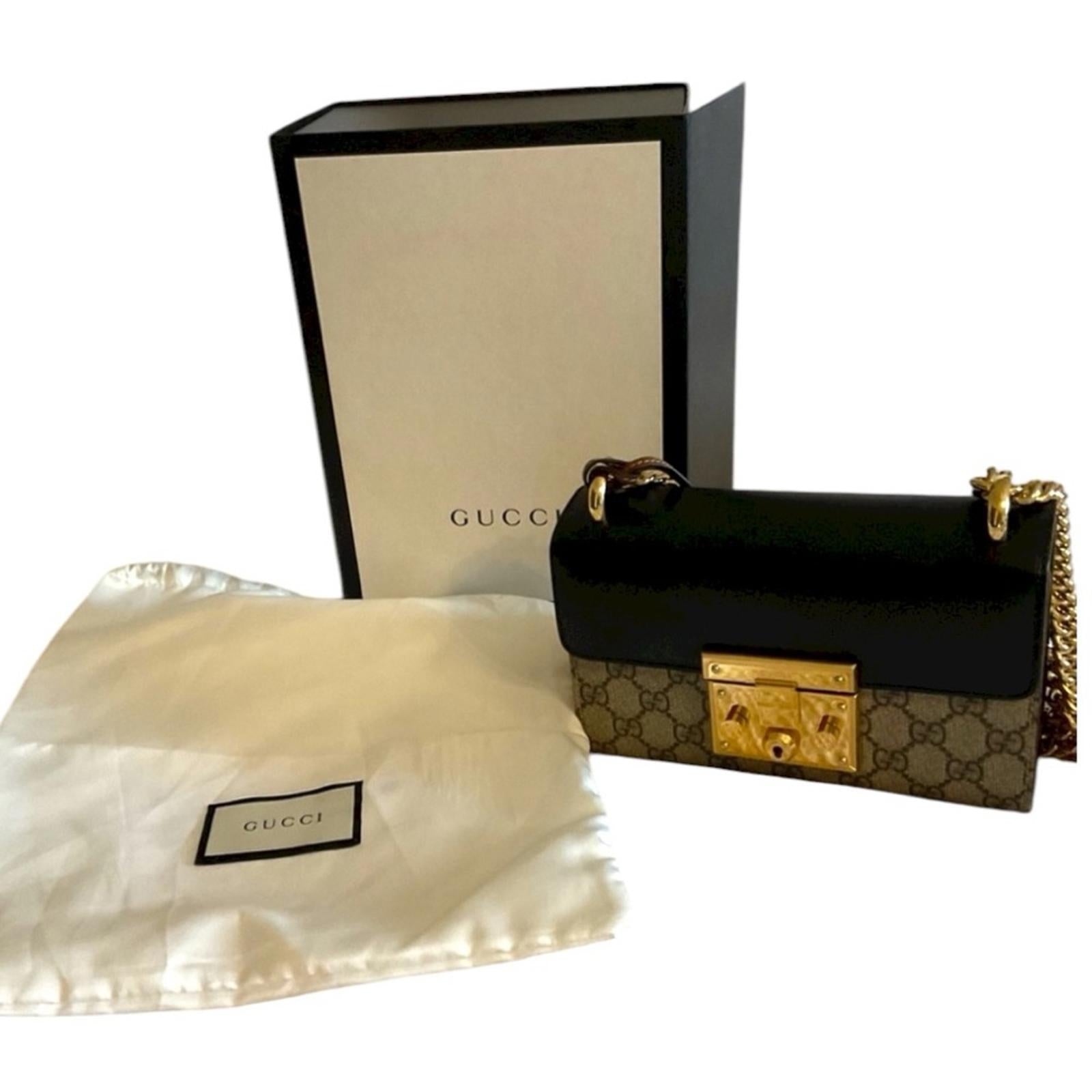 Authentic Gucci Padlock GG Supreme Small Shoulder Bag featuring beige/ebony coated canvas with black leather trim and gold-tone hardware. Structured silhouette with signature padlock closure, key housed in leather clochette, chain shoulder strap, tan suede interior with slip pocket. Includes original box and dust bag.
