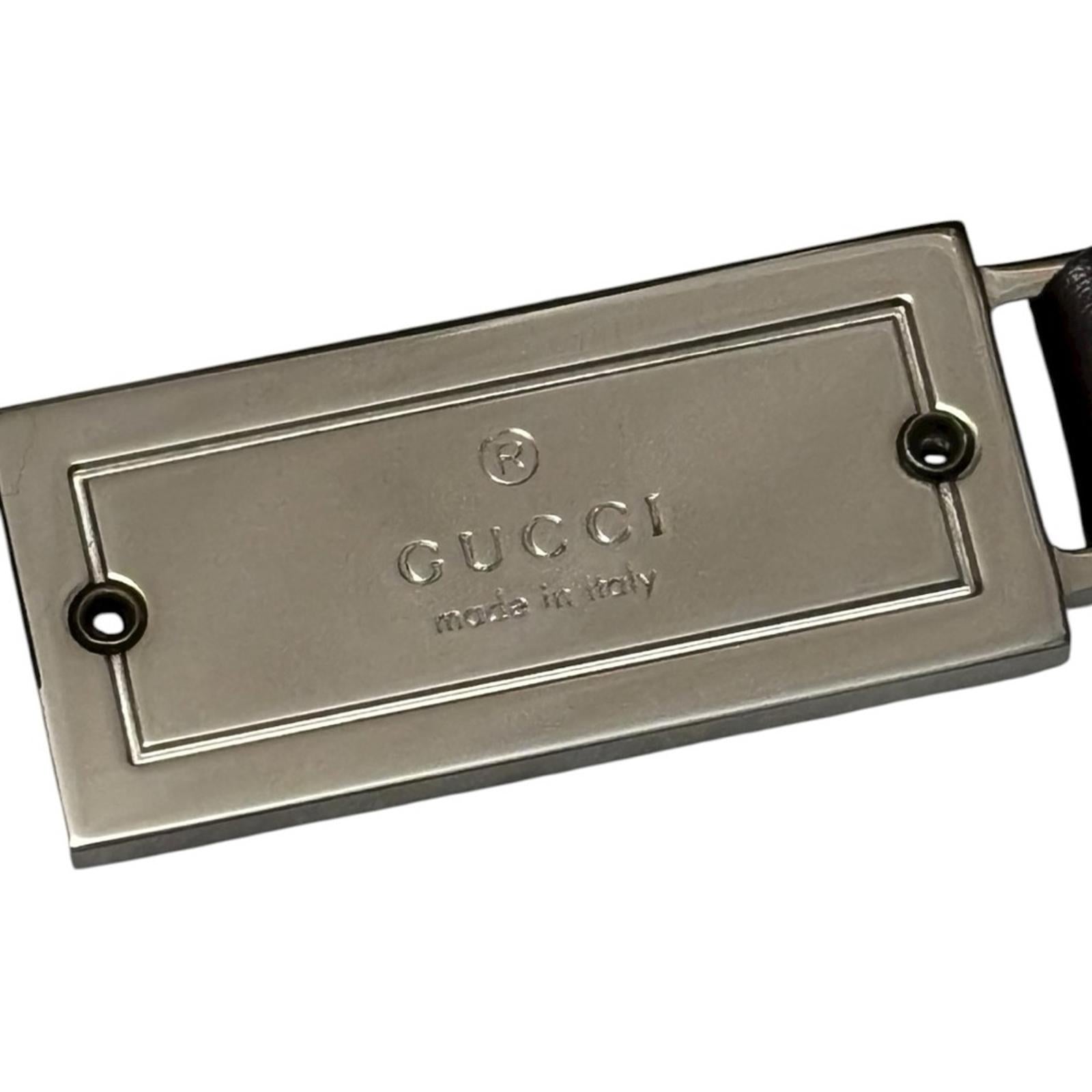 Authentic Gucci keychain crafted in silver-tone metal with embossed “GUCCI Made in Italy” engraving. Features dark brown leather trim and polished hardware. Includes original Gucci GG fabric pouch and presentation box. A refined designer accessory perfect for keys, bags, or gifting.