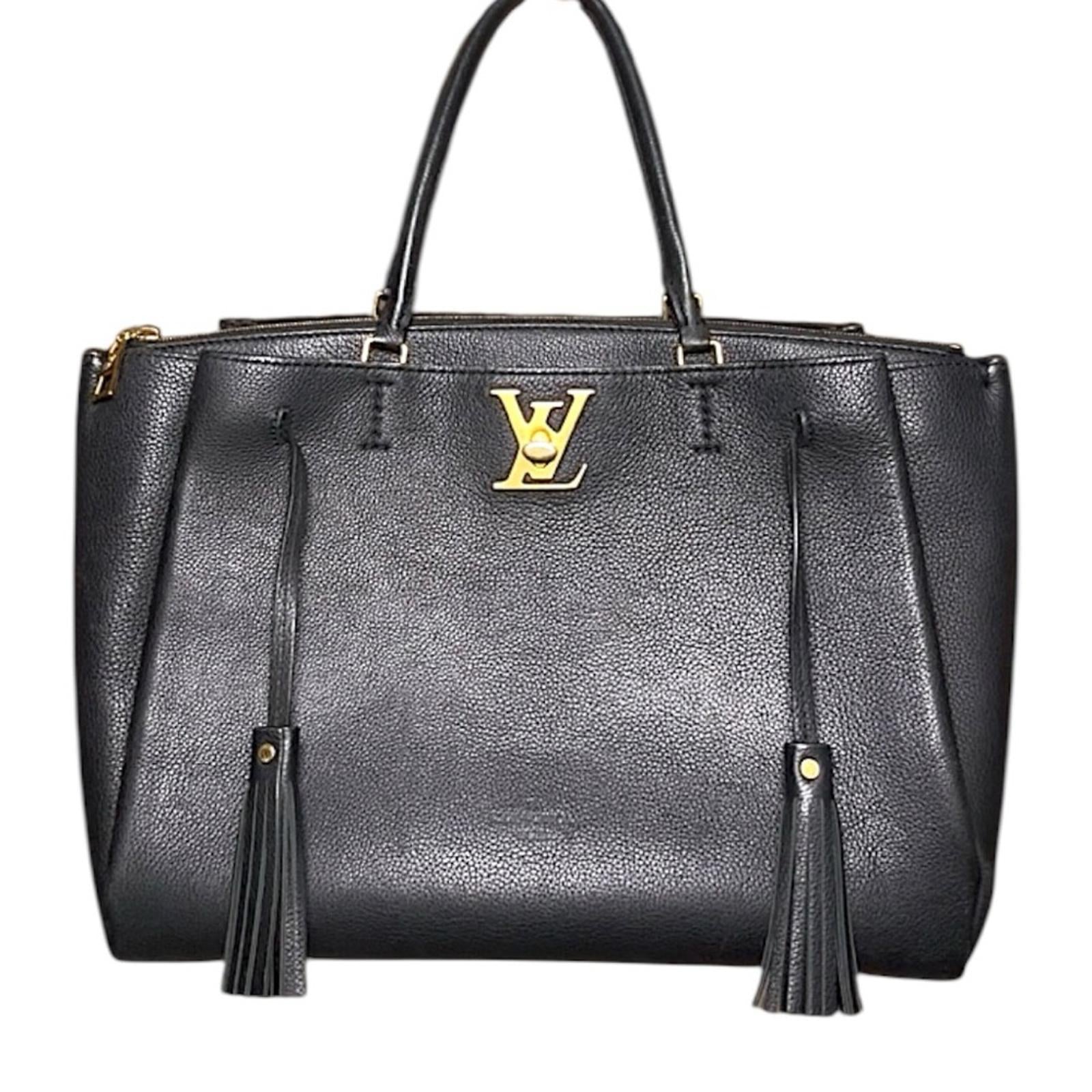 Authentic Louis Vuitton Lockmeto tote in black grained calfskin leather with gold-tone LV twist-lock closure and dual tassel accents. Features structured side panels, rolled leather handles, optional shoulder strap rings, protective bottom feet, and a spacious microfiber-lined interior with zip and slip pockets.