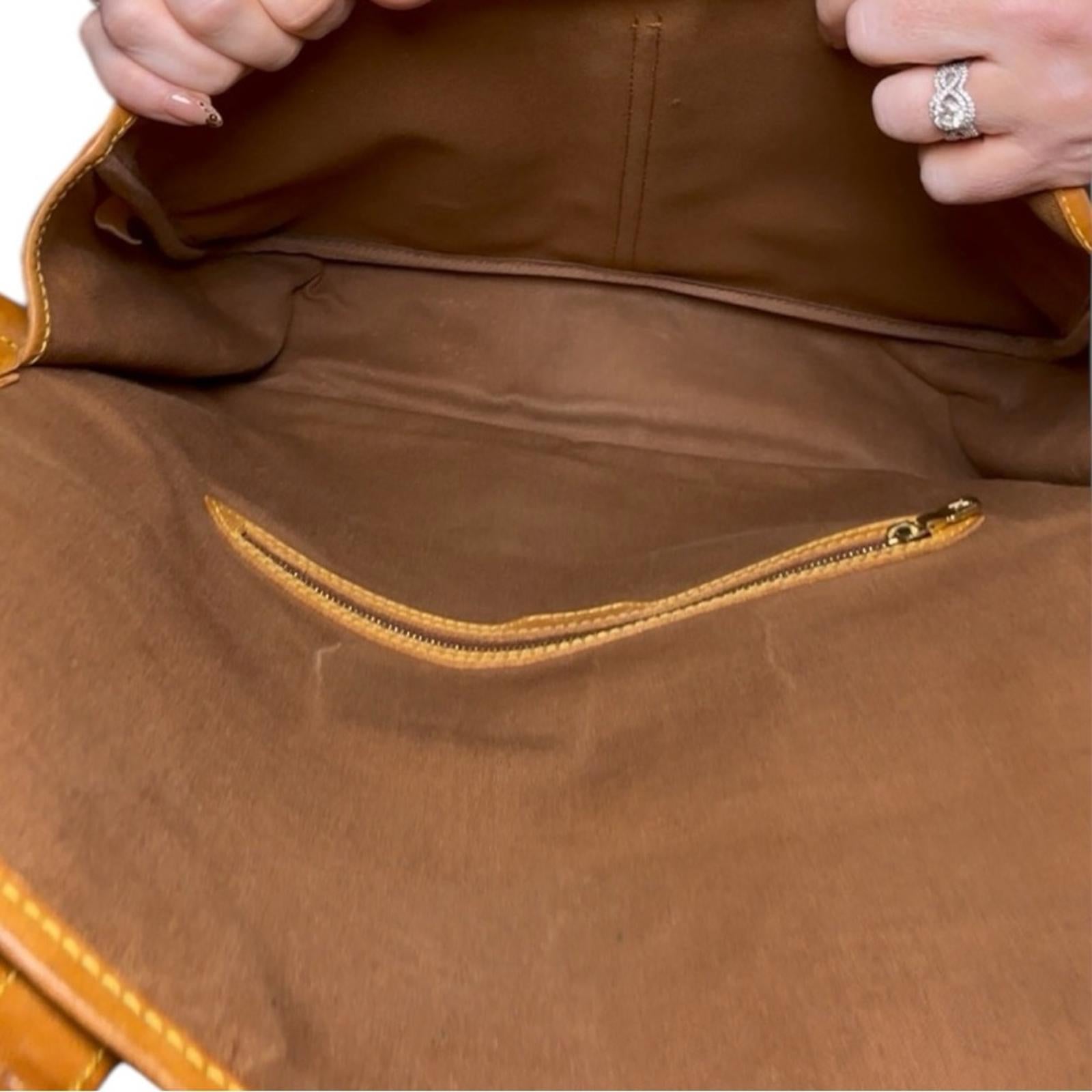 Louis Vuitton Sac Gibecière GM in classic Monogram coated canvas with natural vachetta leather trim. Large crossbody/shoulder messenger-style bag with dual front buckle-flap closures and spacious interior compartment. Features an adjustable shoulder strap, front exterior pockets, and interior slip pocket. Iconic vintage LV design known for function, durability, and generous capacity.