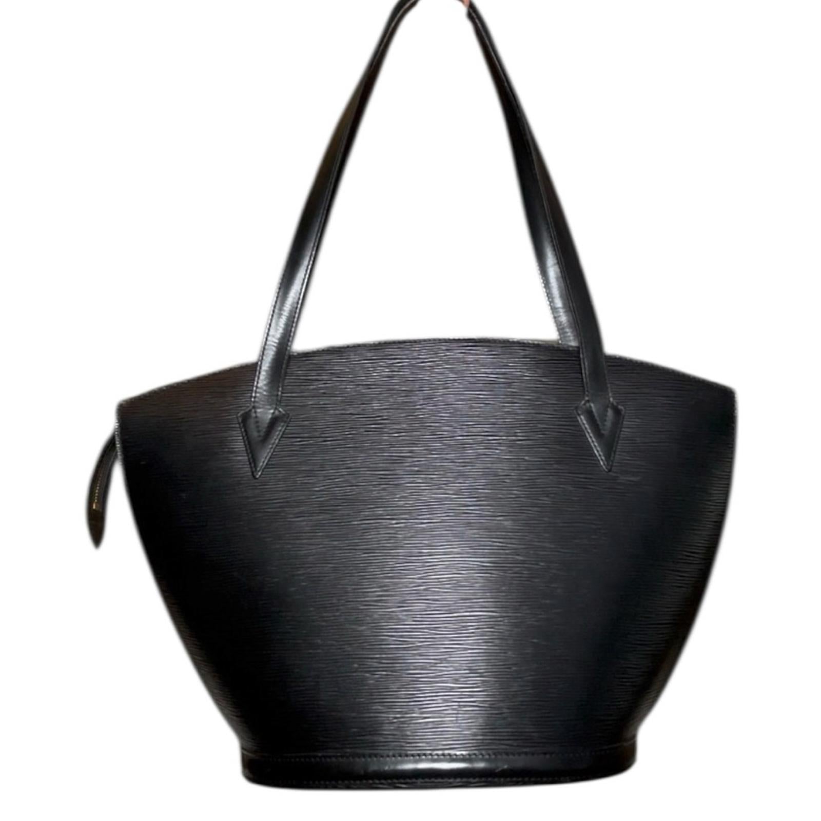 Authentic Louis Vuitton Saint Jacques GM shoulder bag in black Epi leather. Features the iconic structured curved silhouette, long shoulder straps, LV logo embossing, top zip closure, and spacious interior.