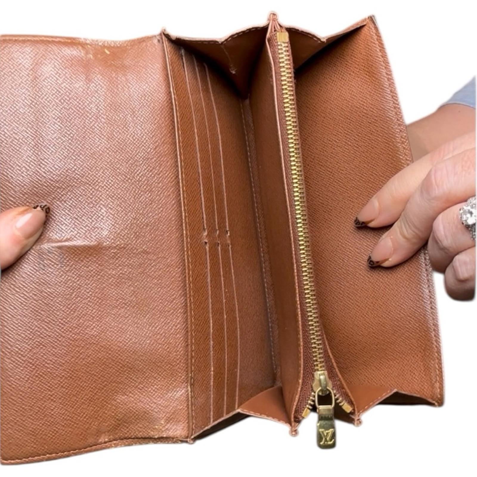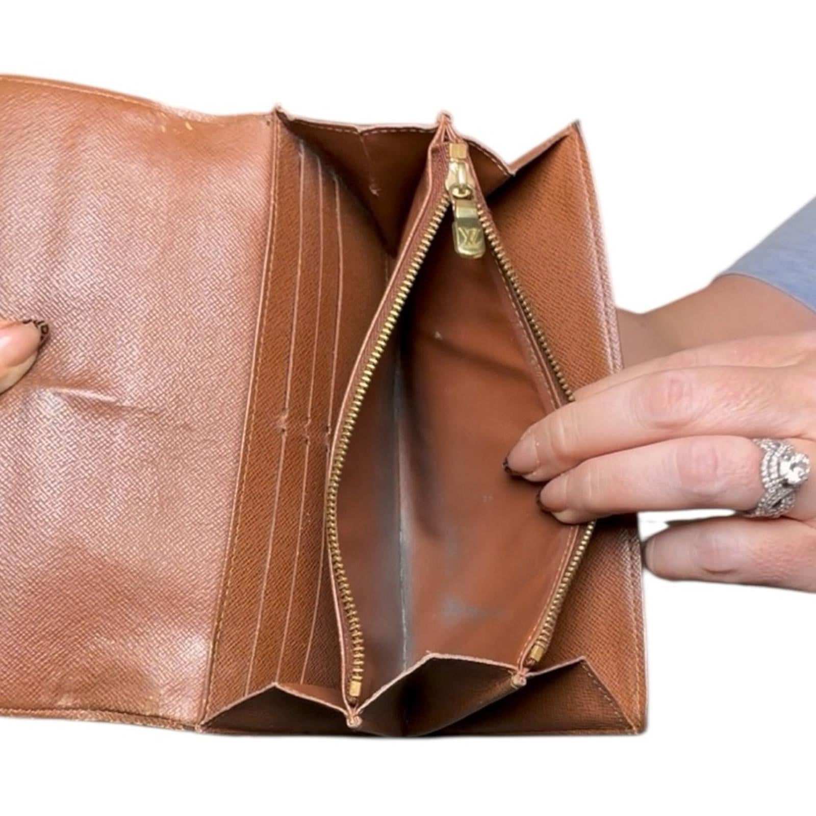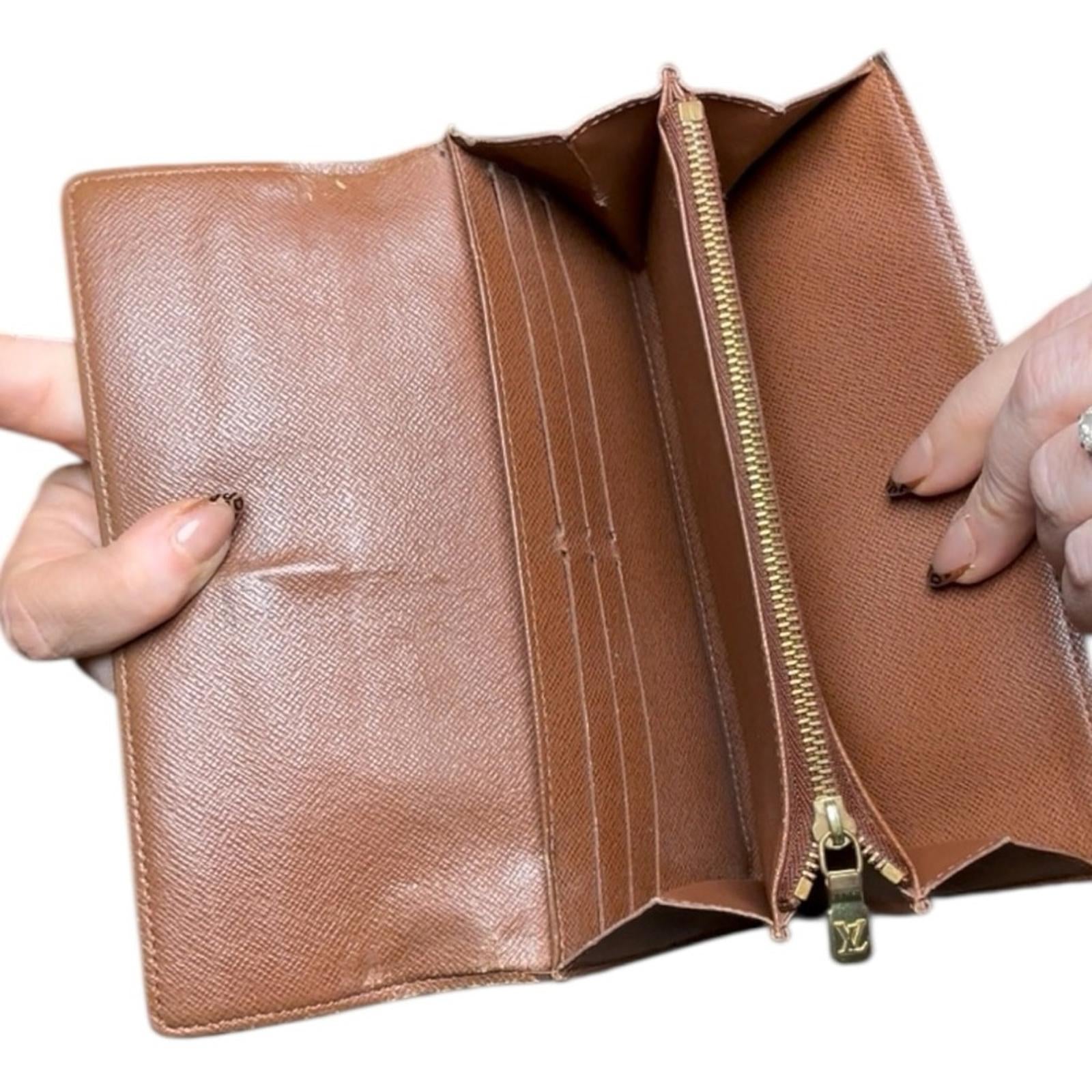 Authentic Louis Vuitton Sarah wallet in classic Monogram coated canvas with brown cross-grain leather interior. Features a full flap snap closure, multiple card slots, long bill compartments, and a zippered coin pocket. Slim, durable, and highly functional design with timeless LV monogram.