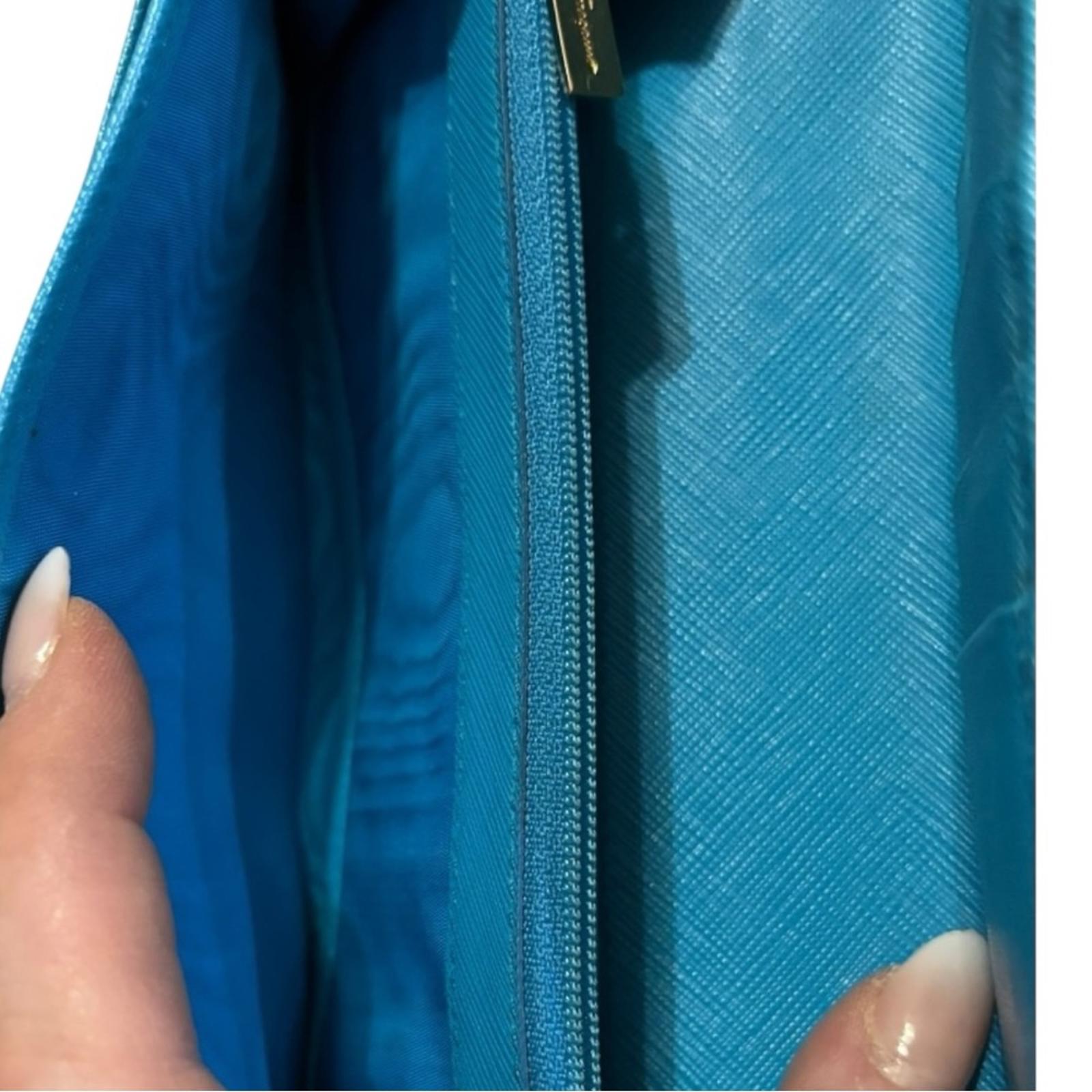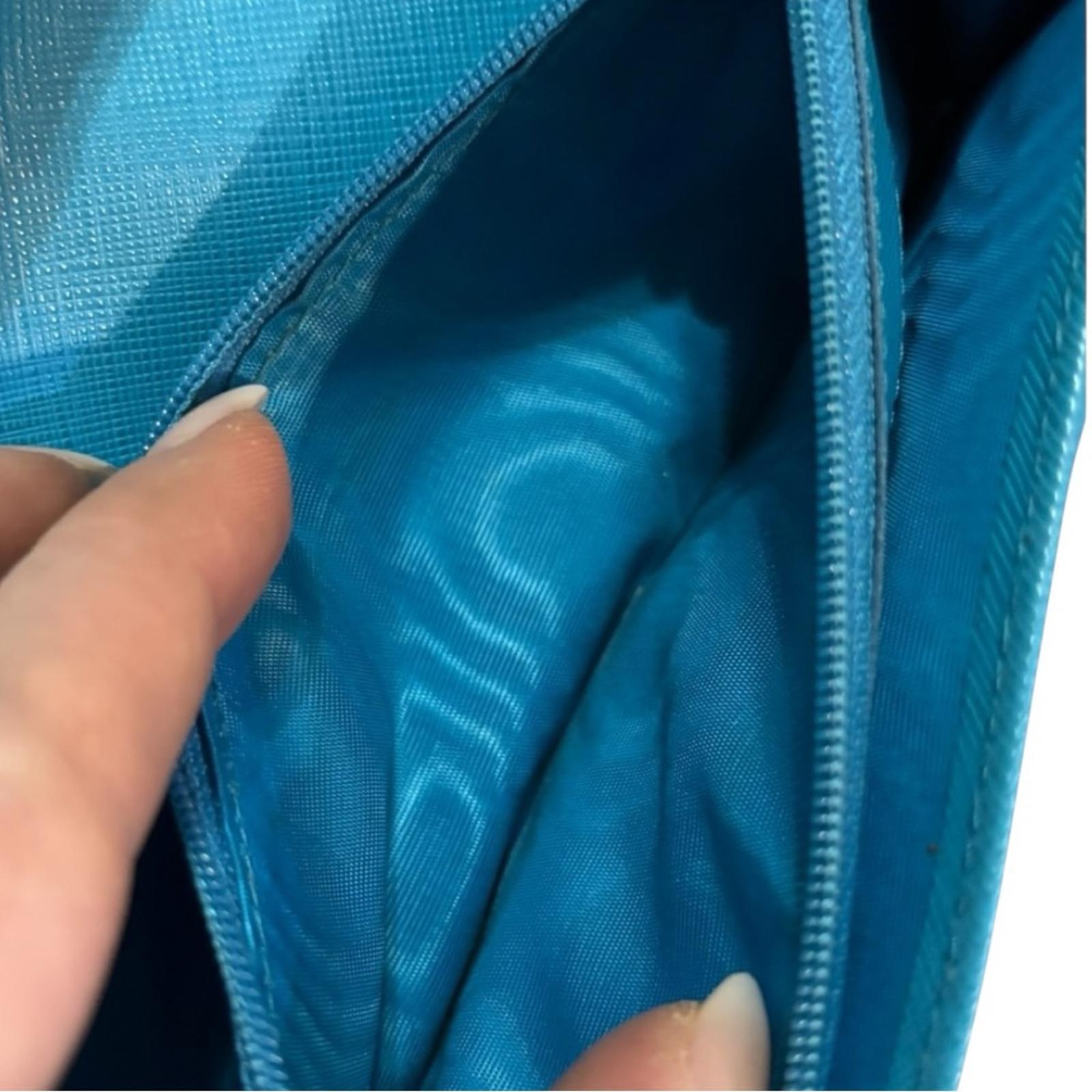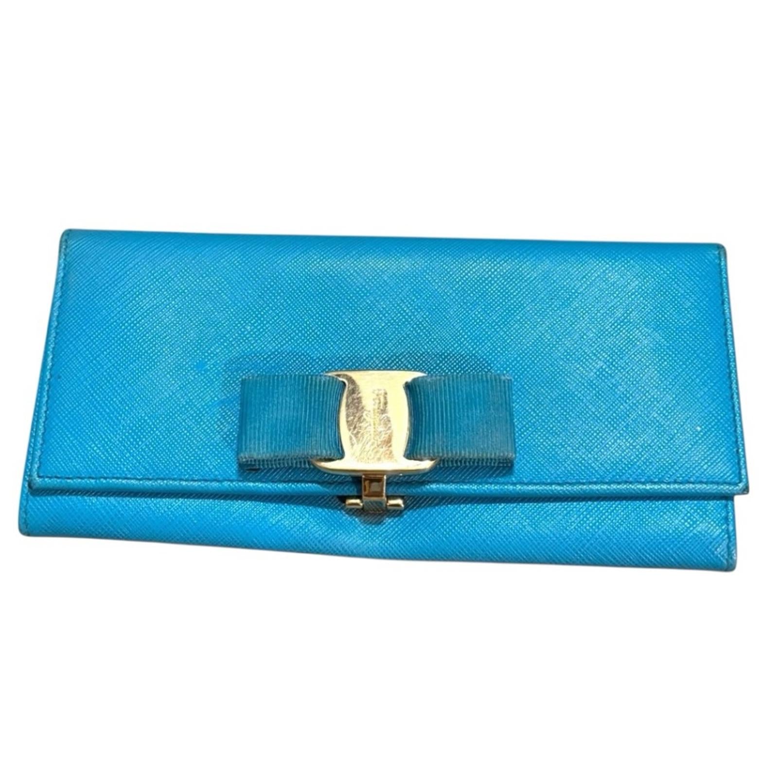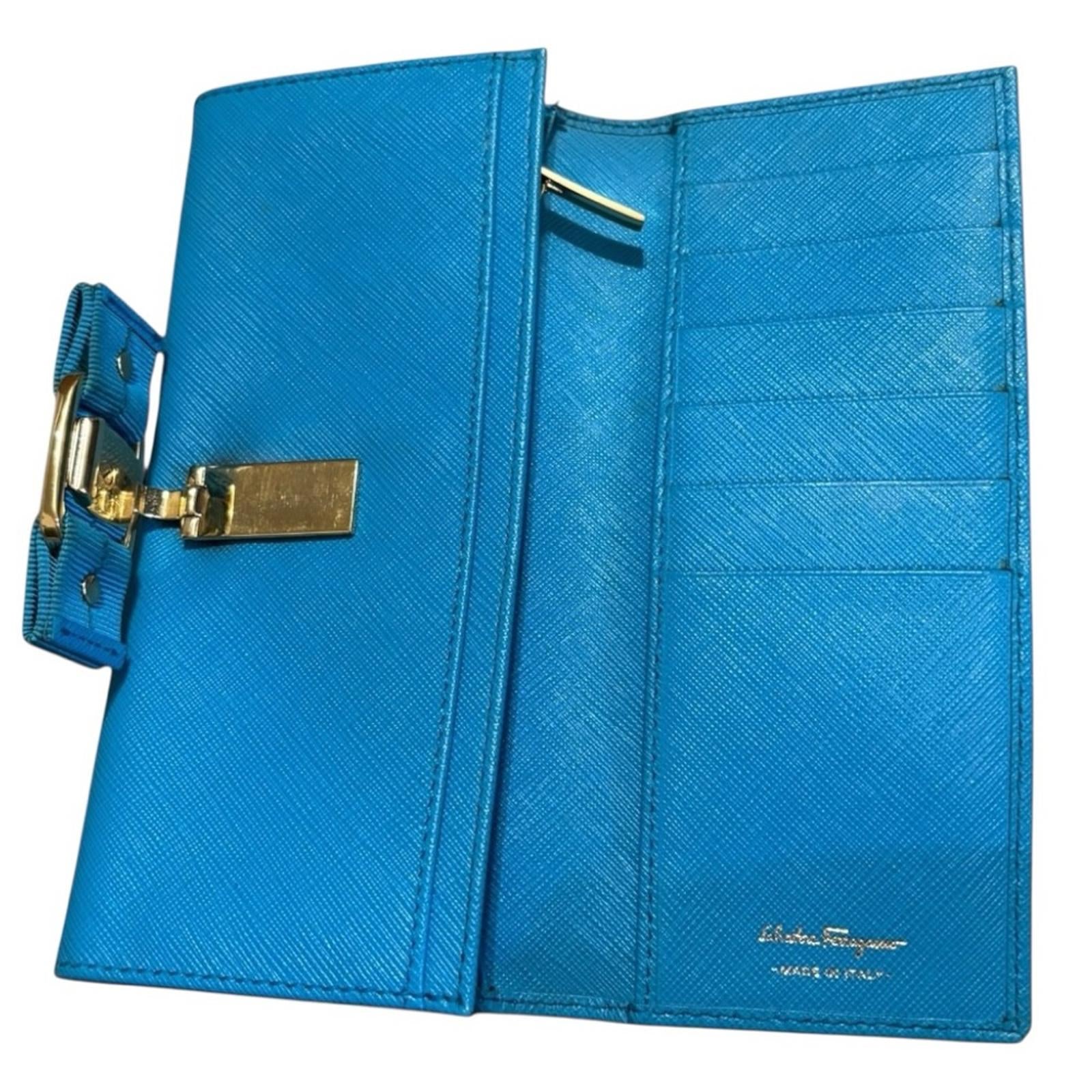Salvatore Ferragamo blue wallet with bow and gold hardware. Minor signs of use.