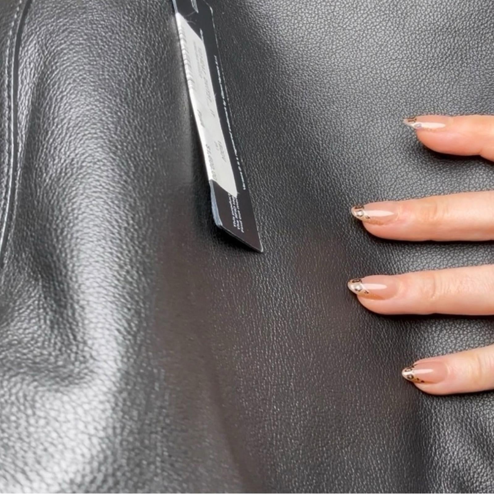 Details: Black leather exterior with gold tone hardware and zip closure. Purple canvas interior.